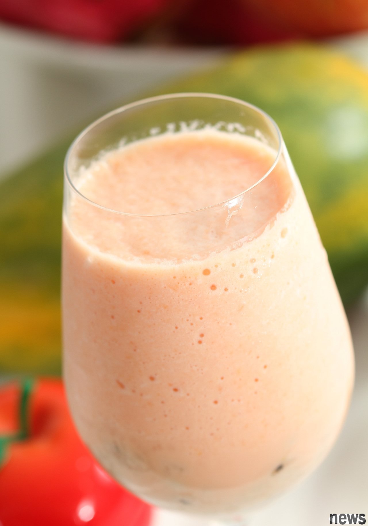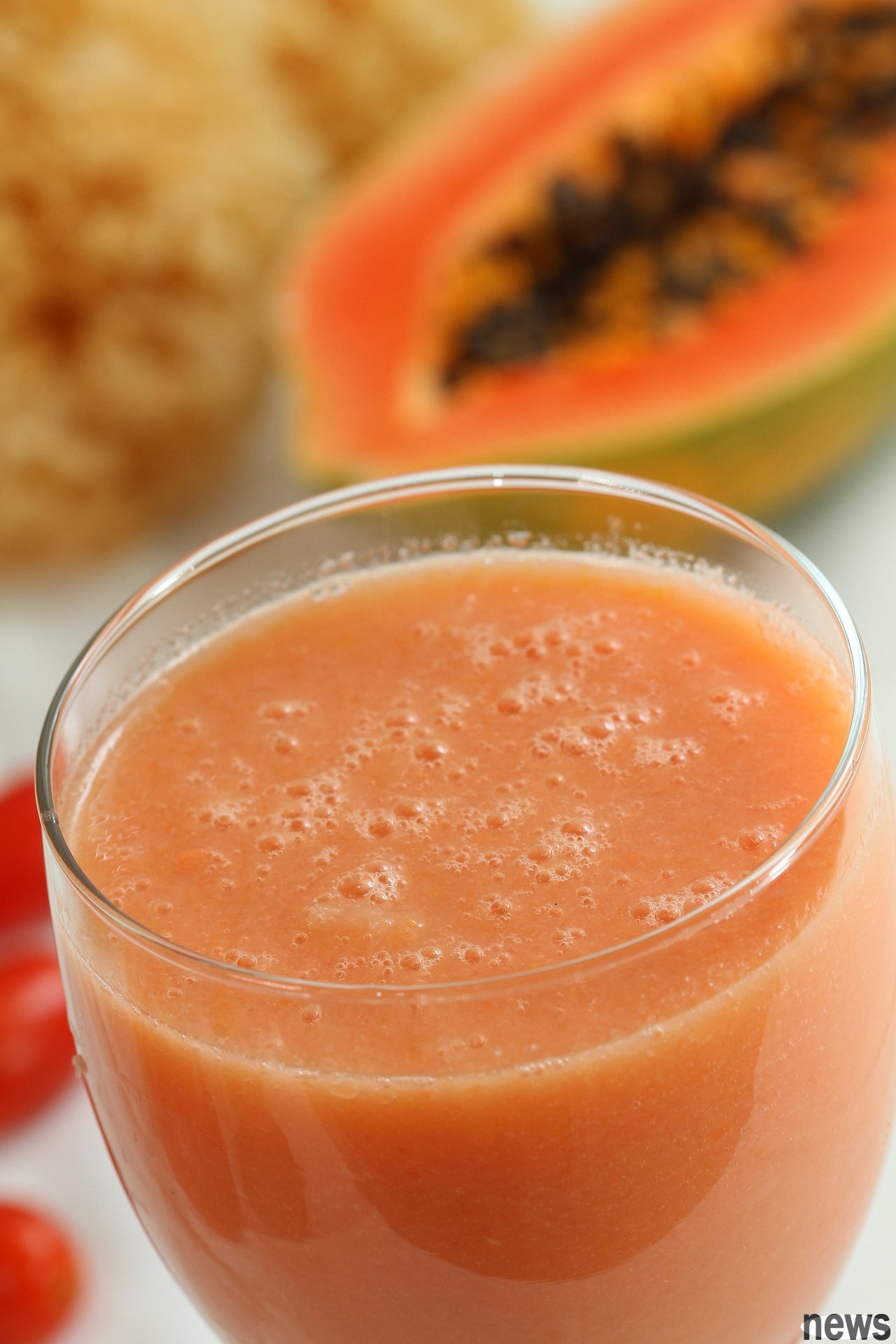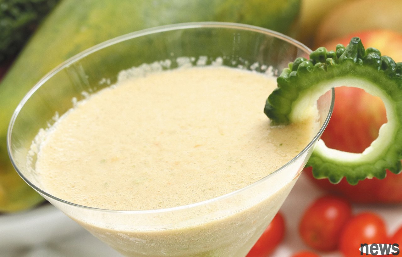 2. Open papaya, mountain bitter gourd, glutinous rice and ice, put it in a juice machine and mix it evenly, pour it into a cup.