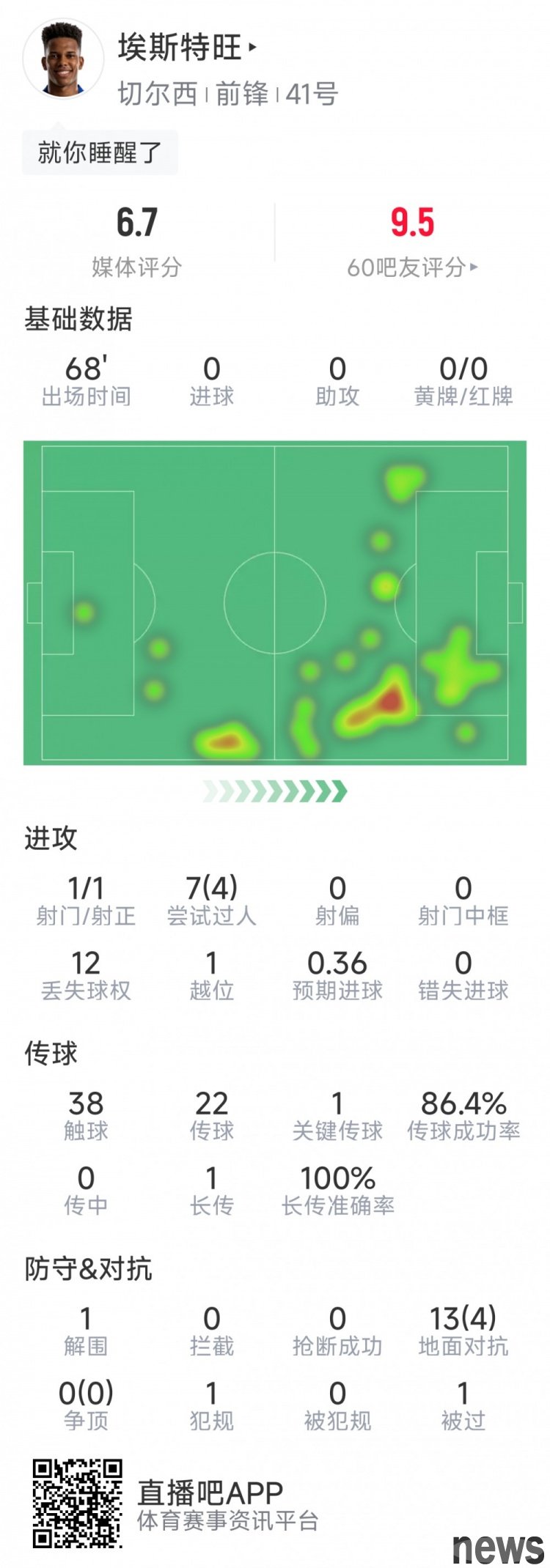 In this round of Premier League Chelsea's match against Fulham, 18-year-old Estewan performed well in the starting lineup. The following is his data in this game: