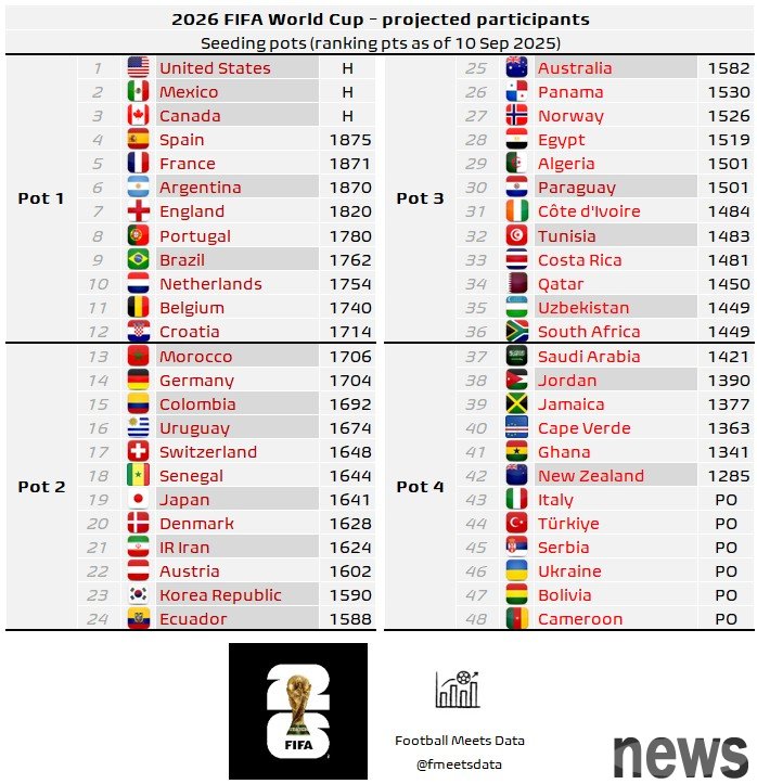 The international match day ended in September, Football Meets Data, the football data media, updated the forecast for the 2026 US, Canada and Mexico World Cup.