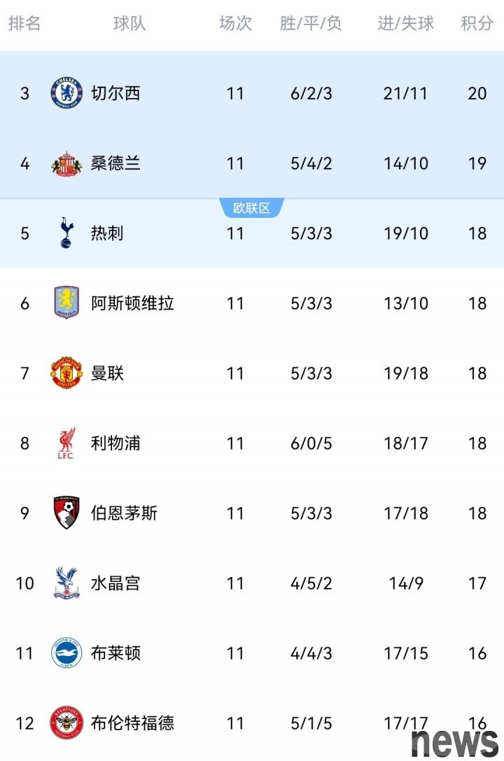 At the end of the 11th round of the Premier League, the competition between the middle and upper reaches of the standings is fierce. From Chelsea in third place to Brentford in 12th place, the point difference is only 4 points.