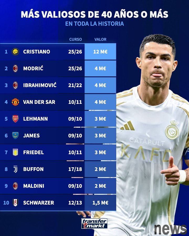 Transfer Market Network has included the value rankings of players over 40 in football history, among which Ronaldo topped the list with 12 million euros this season.