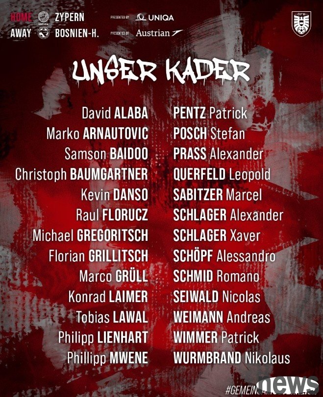 In order to welcome the upcoming World Cup qualifiers against Cyprus and Bosnia and Herzegovich, the Austrian national team announced the new roster, led by Alaba, with Sabitzer, Lemmer and Arnautovic being selected.