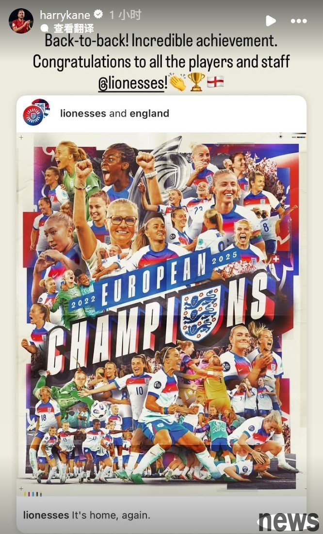 As the captain of the English men's football team, Bayern center Kane also reposted the poster of the English women's football team's championship through social media, and congratulated: "Defending champion! Extraordinary achievements! Congratulations to all the players and staff, @England Women's Football Team."