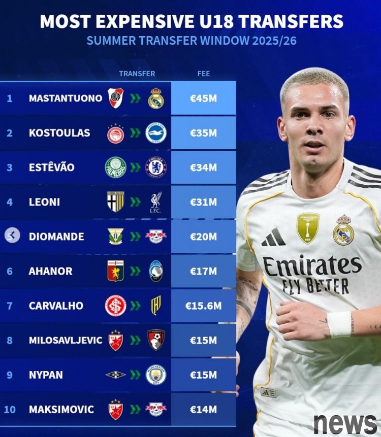 "Transfer Market" counts the most expensive transfer fees for U18 players this summer, with Real Madrid signing Mastantono for 45 million yuan in the first place.