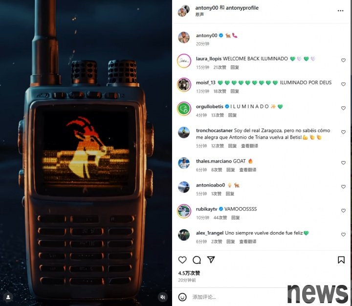 source:vn 7m sportAfter multiple media reports, Anthony will join Betis with a transfer fee of 25 million euros + 50% second transfer, Anthony warmed up his franchise on social media and put on an expression: 🐐📞