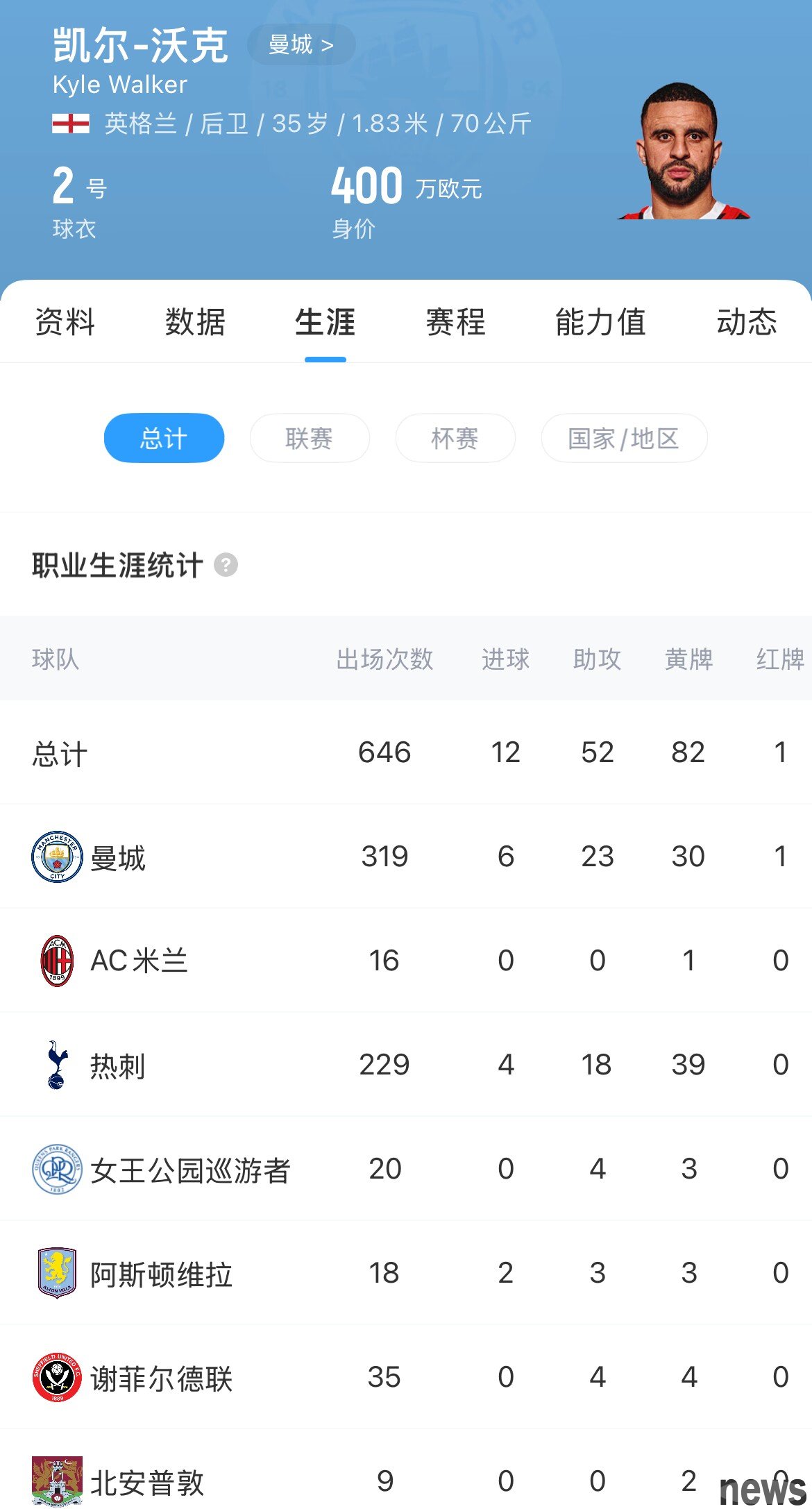Walker joined Manchester City in 2017. So far, he has played in 319 games for the team, scoring 6 goals and assisting 23 times. Walker was loaned to Milan last season, but Milan finally decided not to buy him out.