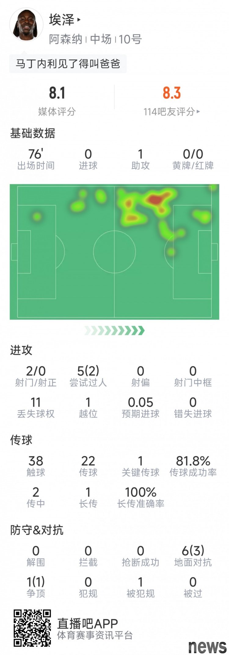 In this round of Premier League Arsenal's match against Nottingham Forest, Eze performed well. The following is his data in this game: