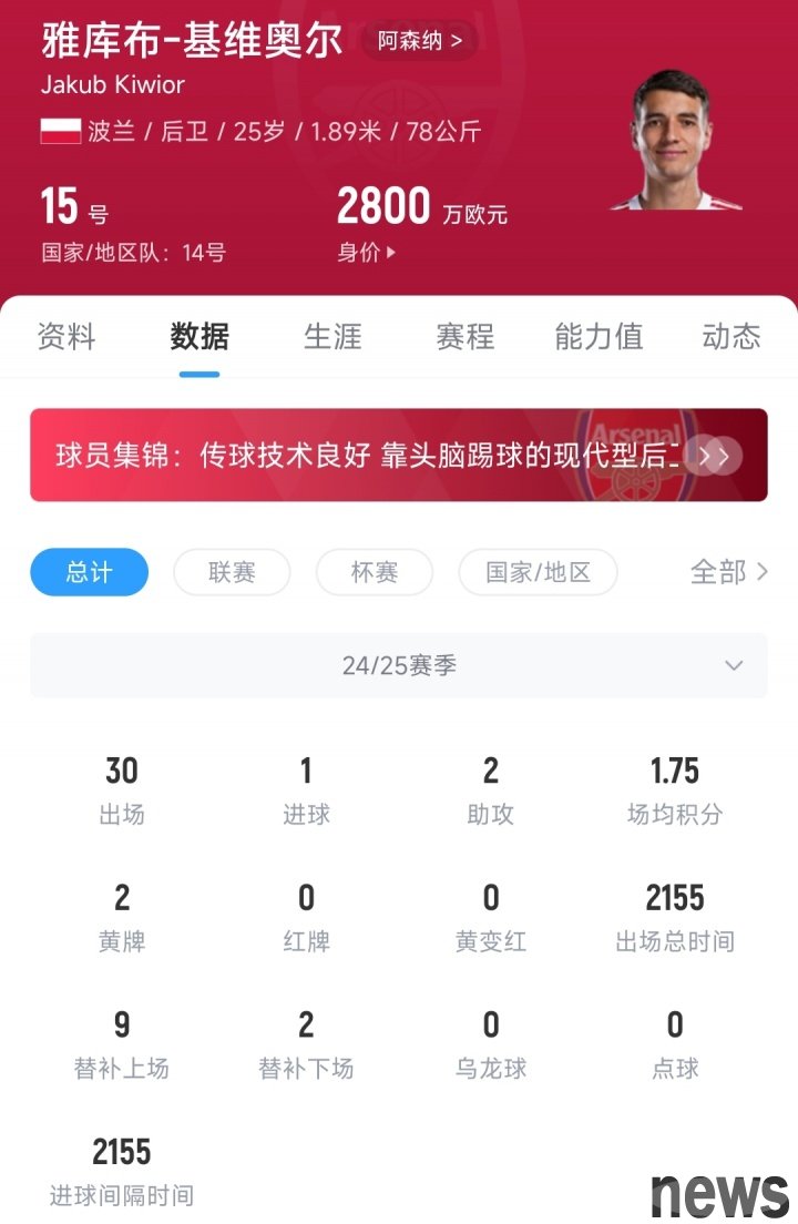 Kiviore is 25 years old, a Polish defender, 1.89 meters tall. He joined Arsenal in the winter window of 2023 with a transfer fee of 19.5 million euros, and has so far contributed 3 goals and 5 assists for the Gunners in 68 games in various competitions.