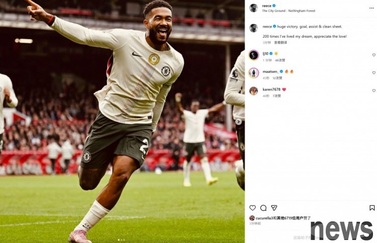 In this game, Reese James reached the 200th game milestone in his team career, and he also made great achievements in passing and shooting. He posted a photo on social media after the game and wrote: "A big win, and scored goals and assists, completed a clean sheet, and made 200 appearances to realize his dream. Thank you everyone for your love!"