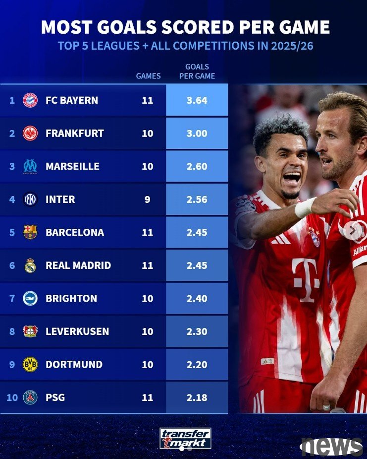 Dezhuan has compiled the list of teams with the most goals per game in the five major leagues this season (in all competitions), with Bayern at the top of the list. The details are as follows: