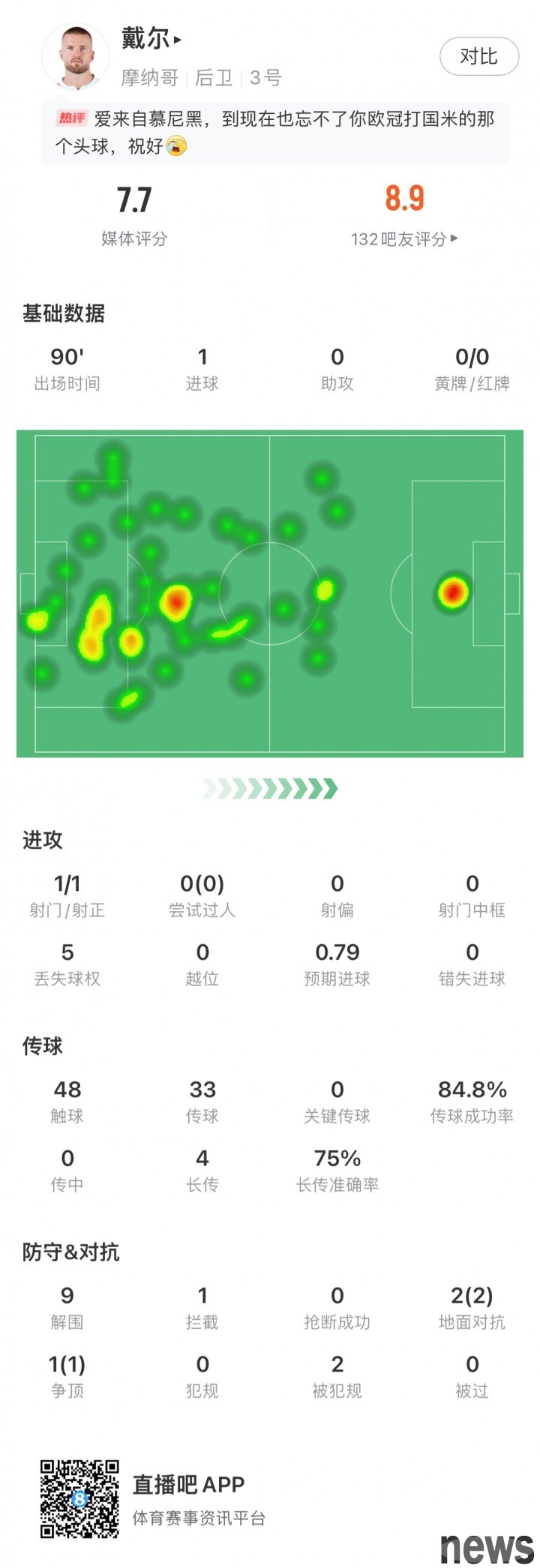 In this game, the 31-year-old Dell started the game and scored 7.7 points. In the team, Dell cleared 9 times in this game and intercepted 1, 2 confrontations and 1 top-up. He also made a point and took the penalty and hit it himself.
