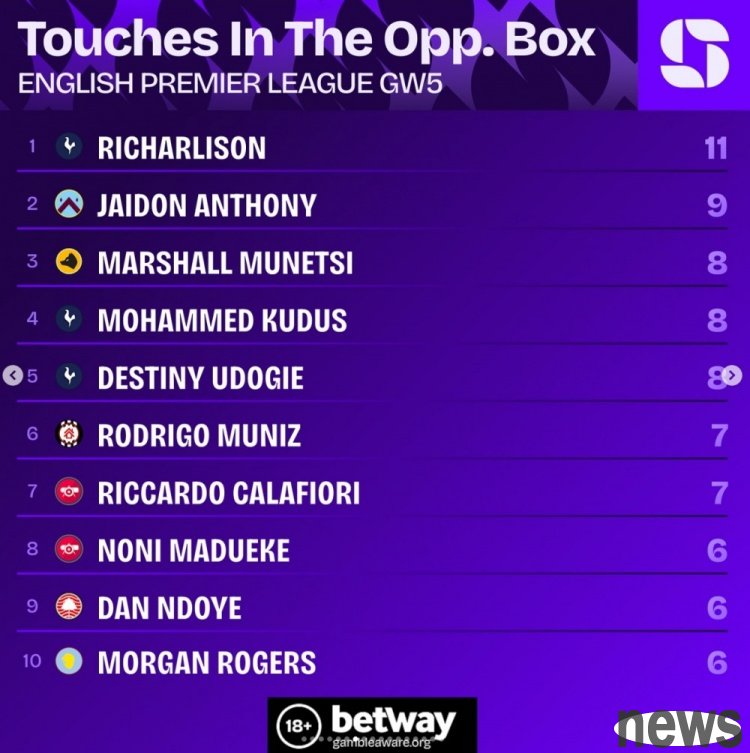 After the fifth round of the Premier League, squawkafootball ranked all data rankings, Tottenham striker Richarlison was the player with the most touches in the opponent's penalty area in this round, with a total of 11 times.