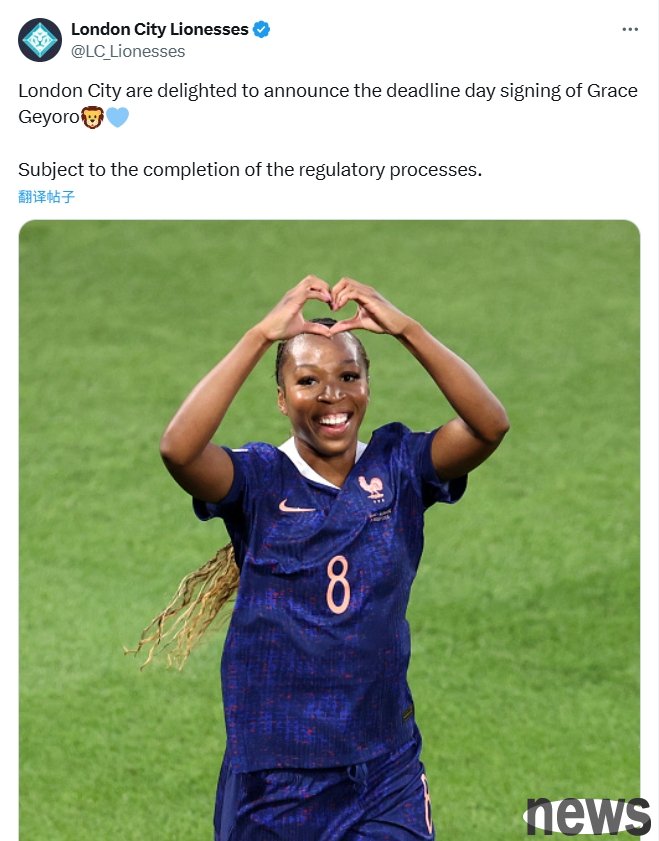 4:50pm, 5 September 2025 According to official news, the London City Lioness Women's Football Team signed Paris midfielder Geiero. According to the BBC, the transfer fee was 1.4 million pounds, setting a new record for female football players' transfer fee.