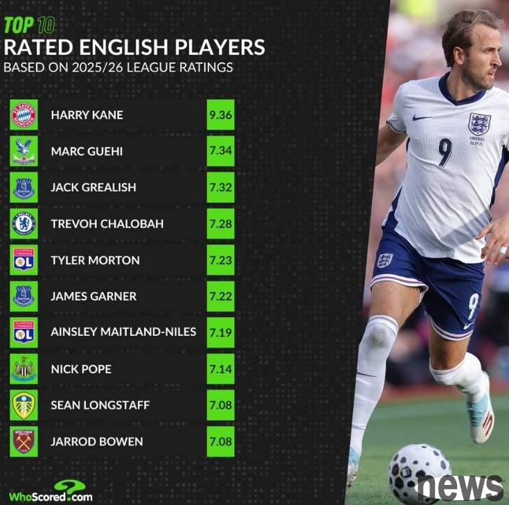 England will announce the latest team list soon. The data website Whoscored also included the average score list of English players in each league this season, as follows: