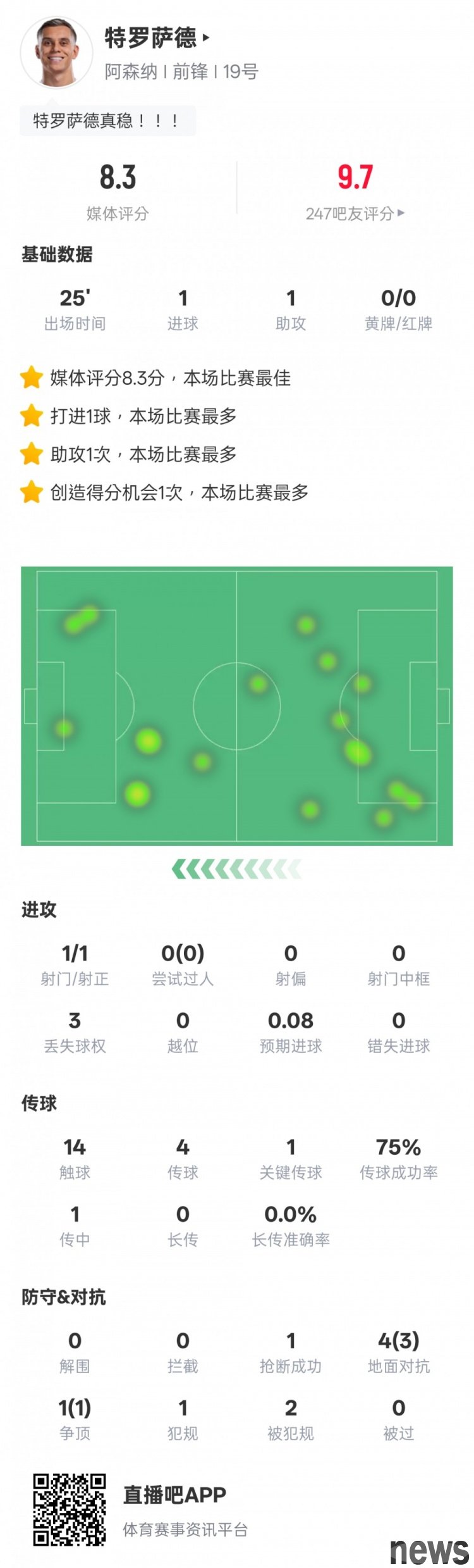 In the first round of the Champions League stage, Arsenal played 2-0 away. Trosad came on as a substitute, made a pass and shot, and had one key pass, with a highest score of 8.3 in the game.