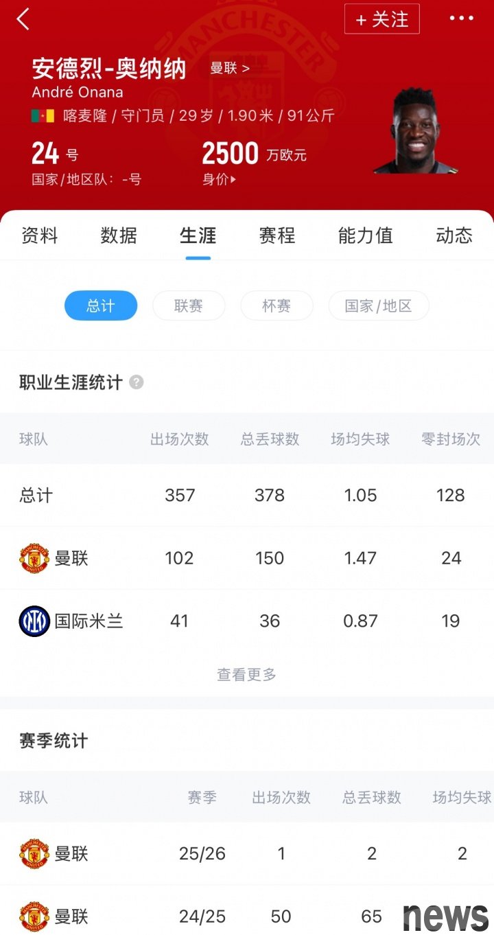 Onana is 29 years old. Manchester United spent 50.2 million to introduce him from Inter Milan in 2023. Currently, Germany's price is 25 million euros. Onana only made a appearance in the League Cup once in the new season, and lost to the English League Two team Greensby in the penalty shootout. Manchester United started all three Premier League games this season.