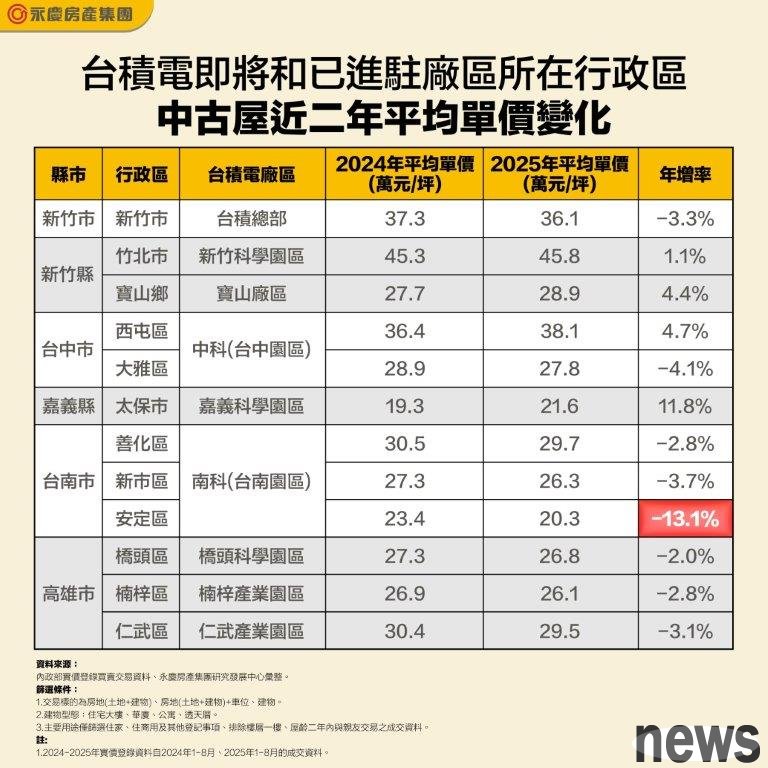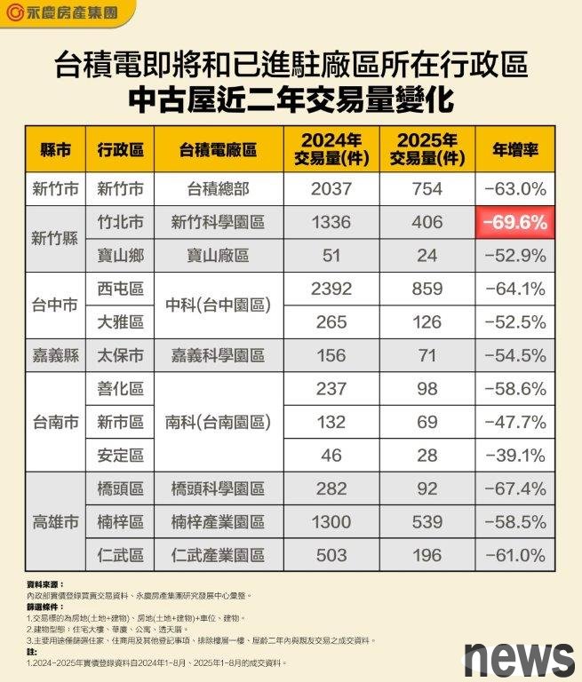 The site selection of TSMC's factory in the "Sacred Mountain that Protects the Country" has become a subject of much attention in the housing market in recent years. Yongqing Real Estate analyzed the administrative districts where TSMC will and has already entered the factory based on actual price registration data. Changes in the transaction price of second-hand houses in the past two years revealed that the transaction volume of TSMC houses has decreased across the board this year, with the largest decrease of nearly 70% in Zhubei City. As for the largest correction in house prices, it was 13.1% in Anding District of Tainan City.